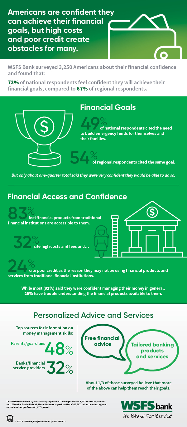 WILMINGTON, Del., April 07, 2022 (GLOBE NEWSWIRE) -- Nearly three-quarters of Americans (72%) feel confident they will achieve their financial goals, according to a new WSFS Bank survey. However, two-in-five (39%) said they’re not confident they can keep pace with inflation’s impact on goods and services, and nearly a quarter (24%) say having poor credit prevents them from using financial products and services, underscoring the challenges consumers currently face when managing their money.
